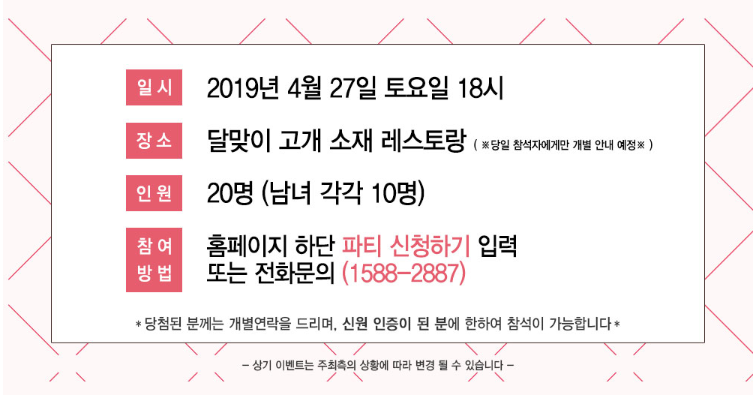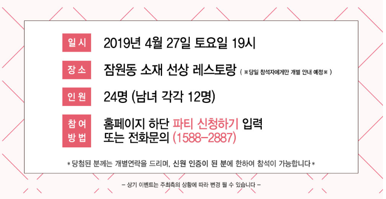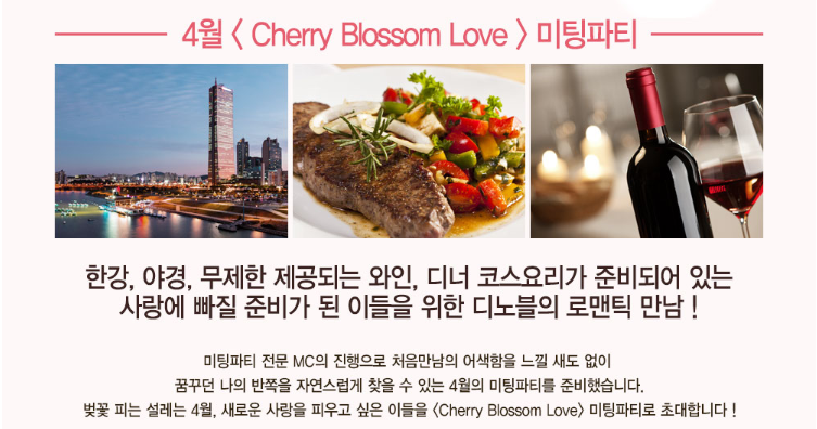 결혼정보회사 디노블이 인증한 사람들과의 안전한 만남이 보장되는 4월의 <Cherry Blossom Love> 미팅파티는 2019년 4월 27일 토요일 19시에 잠원동 소재 선상 레스토랑에서 한강의 야경을 보며 진행됩니다. 미혼남녀 24명을 초대하며, 두근거리는 영화 같은 만남을 원하는 분들은 결혼정보업체 디노블의 홈페이지 하단의 파티 신청하기 또는 대표번호로 문의하시면 됩니다. 새로운 사랑을 찾는 많은 분들의 빠른 신청을 바랍니다!