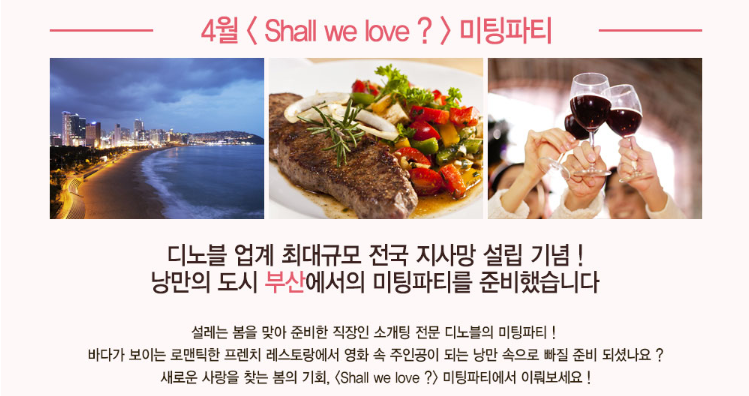 결혼정보회사 업계 최대 규모 전국 지사망 설립 기념으로 펼쳐지는 4월의 부산 미팅파티는, 설레는 계절 봄을 맞아 준비한 직장인 소개팅 전문 디노블의 노하우를 담은 만남의 자리를 마련했습니다. 바다가 보이는 로맨틱한 프렌치 레스토랑에서 나만의 로맨틱 영화 속 주인공이 되는 낭만 속으로 빠질 준비되셨나요?! 새로운 사랑을 찾는 봄의 기회 <Shall we love?> 미팅파티로 초대합니다!