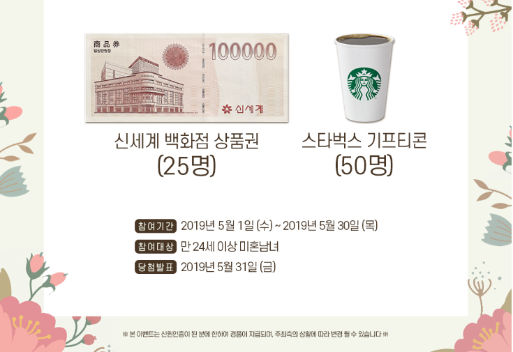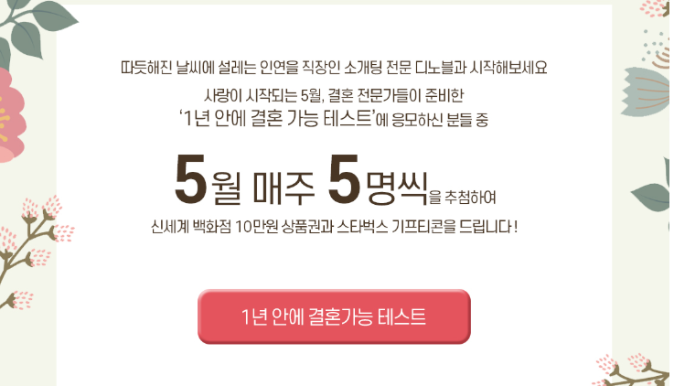 따뜻해진 날씨, 좋은 사람과 함께 설레는 만남을 이어가고 싶은 미혼남녀분들이라면 주목! 직장인들을 위한 전문적인 소개팅을 진행하는 디노블의 결혼 전문가들이 심혈을 기울여 완성한 '1년 안에 결혼 가능 테스트'에 참여하신 미혼남녀 중 추첨을 통해 5월 한 달 동안 매주 5명씩을 추첨하여 신세계 백화점 10만원 상품권과 스타벅스 기프티콘을 드립니다!