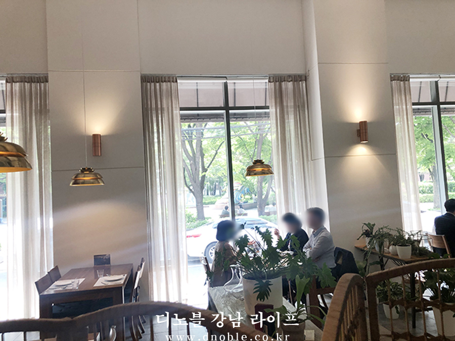 평일 낮 시간이었지만 꽤 많은 사람들이 따뜻한 5월의 날씨를 즐기며 높은 천장과 통유리 너머 푸른 공원을 가진 전망 좋은 식당 살로토봄봄에서 즐거운 시간을 보내고 있었습니다.