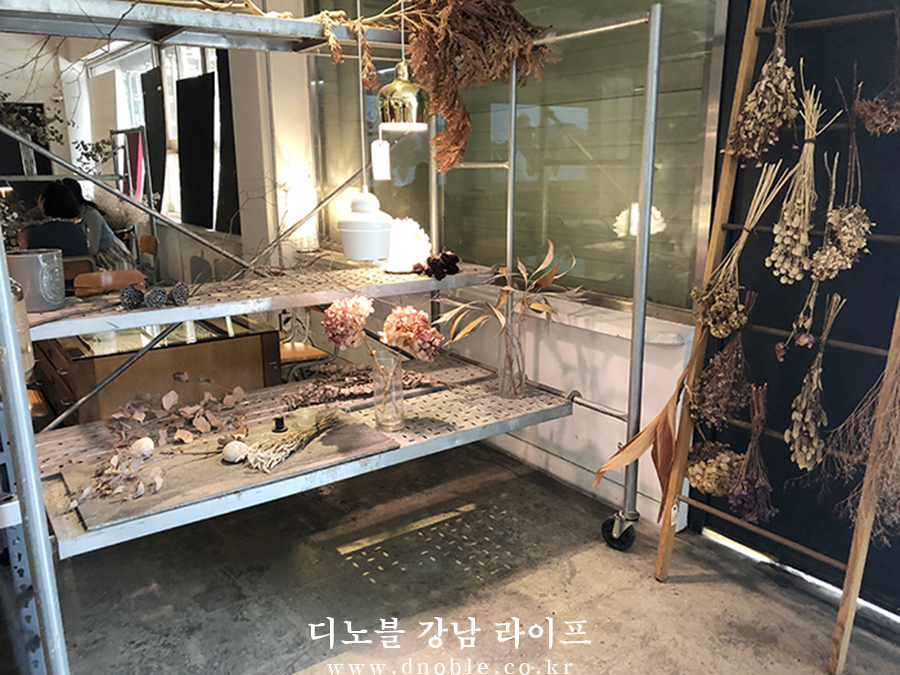 드라이플라워로 곳곳에 꾸민 꽃들은 삭막한 느낌이 들 수도 있는 카페에 아늑한 느낌을 주며 편안하게 즐거운 시간을 보낼 수 있게 해줍니다.