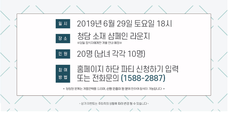 이번 결혼정보회사 디노블의 솔로탈출 6월 <D.noble PARTY>는 2019년 6월 29일 (토), 18시에 청담 소재 샴페인 라운지에서 펼쳐지며 당일 참석자에게 개별 안내 드릴 예정입니다. 직장인 소개팅에 관심 있는 미혼남녀 각각 1명, 총 20명을 초대한 설레는 미팅파티로 초대합니다!