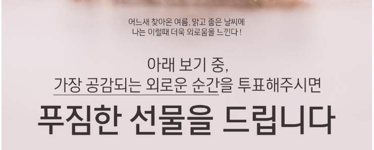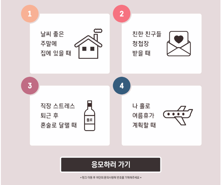 '① 날씨 좋은 주말에 집에 있을 때, ② 친한 친구들 청첩장 받을 때, ③ 직장 스트레스 퇴근 후 혼술로 달랄 때, ④ 나 홀로 여름휴가 계획할 때' 4가지 보기 중 가장 공감되는 외로운 순간을 투표해주시면 됩니다! 응모 방법은 '응모하러 가기'버튼을 통해 선물 받으실 정보 입력 후, 하단의 문의사항에 보기 전호를 기재해주시면 됩니다!