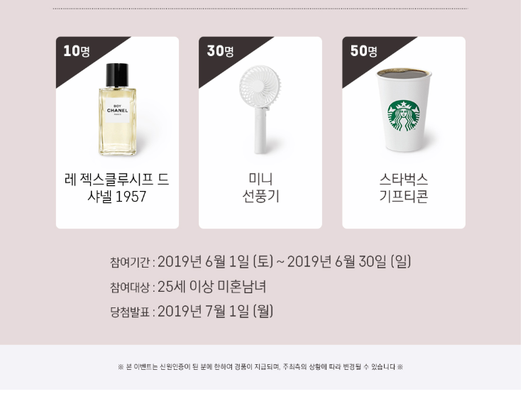 6월 솔로탈출 이벤트 선물로는 여름 필수 아이템인 로망의 향수 레 젝스클루시프 드 샤넬 1957, 미니 선풍기, 스타벅스 기프티콘을 증정합니다. 참여 기간은 2019년 6월 1일 (토) ~ 2019년 6월 30일 (일)까지이며 25세 이상 미혼남녀를 대상으로 진행합니다. 당첨자는 2019년 7월 1일 (월) 개별 연락드리며 신원인증이 된 분에 한하여 경품이 지급되는 점 참고해주세요!