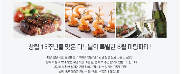 안녕하세요. 솔로탈출 전문 디노블 강남 라이프입니다. 오늘은 싱글남녀들을 위한 결혼정보회사 디노블의 솔로탈출 6월 미팅파티, 이벤트 소식을 들고 왔습니다. 더 이상의 외로움은 그만! 새로운 사랑을 찾아 설레는 만남을 시작하고 싶은 분들이라면 주목해주세요!