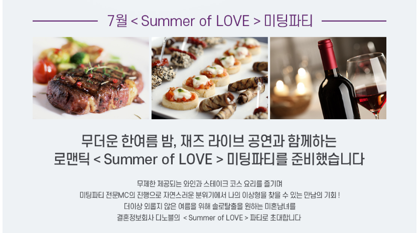 무더운 한여름 밤, 재즈 라이브 공연과 함께하는 로맨틱 만남의 기회 <Summer of LOVE>는 무제한 제공되는 와인과 스테이크 코스 요리를 즐기며 미팅파티 전문 MC의 진행으로 자연스러운 분위기에서 나의 이상형을 찾을 수 있는 만남의 기회입니다.
