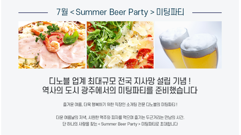 2004년 서울 청담동 결혼정보회사로 시작하여 올해로 15주년을 맞이한 결혼정보회사 디노블은 광주지사 외 주요 도시에 전국 지사망을 설립해 디노블만의 고품격 서비스를 이용하실 수 있게 되었습니다. 7월 솔로탈출 미팅파티는 역사의 도시 광주의 더운 여름날의 저녁, 시원한 맥주와 피자를 먹으며 즐기는 두근거리는 만남의 시간을 마련했습니다.