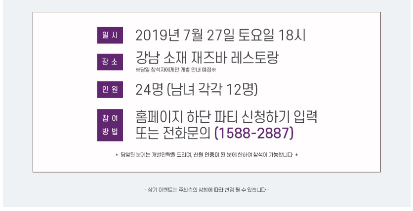 지금까지 광주결혼정보회사 디노블의 7월 미팅파티 소식을 전해드렸습니다. 더운 여름, 더 뜨거운 사랑을 원하는 미혼남녀분들에게 좋은 만남을 이룰 수 있는 기회가 될 수 있도록 디노블이 함께 하겠습니다!