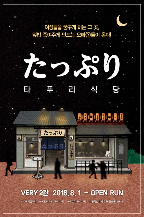 색다른 주제의 즐거운 이야기를 담고 있는 작품 '타푸리 식당'은 사람들의 분주한 발걸음이 멈추는 곳, 안 먹어 본 사람은 있어도 한 번만 가본 사람은 없다는 일식당 '타푸리'는 맛의 비밀을 지키기 위해 굳게 닫혀 있던 식당에서 드디어 새로운 가족, 여직원을 뽑게 됩니다. 하지만 요리계 꿈나무니 재희는 우여곡절 끝에 여장을 하고 취업에 성공하게 되며 벌어지는 시끌벅적 브로맨스의 스토리가 펼쳐집니다. 그리고 연극 '타푸리 식당'의 특별한 점은 공연장 위층에 실제로 영업을 하고 있는 식당이 있으며 공연 후 식당을 방문하면 연극배우들이 직접 요리를 하고 이야기를 나누며 관객과 소통하는 시간을 가질 수 있습니다. 공연 후 배우들이 만들어주는 음식까지 한 번에 즐길 수 있는 '타푸리 식당'을 보며 즐거운 애프터 데이트를 즐기실 수 있습니다.