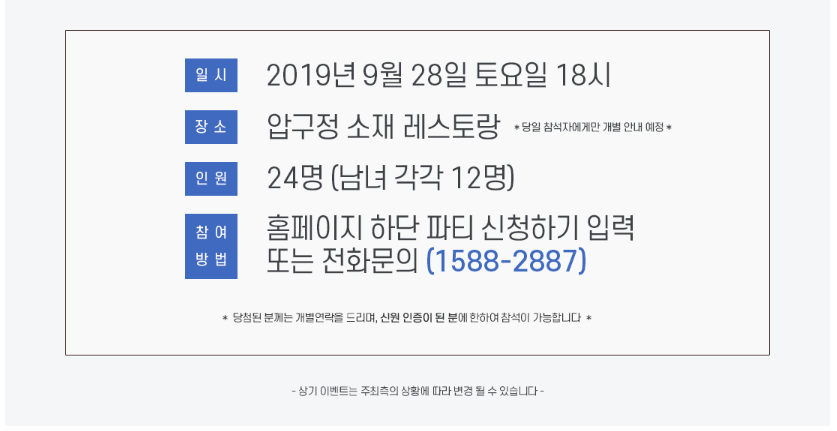 | 디노블_미혼남녀의 새로운 사랑 찾는 10월 미팅파티 ♥ (0) | 2019.10.02 |