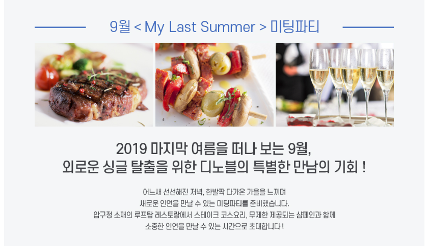 안녕하세요. 직장인 소개팅 전문 디노블 강남 라이프입니다. 오늘은 가장 외로운 계절 가을이 되며 더욱 외로움을 느끼는 미혼남녀를 위한 솔로탈출 전문 디노블의 9월 미팅파티 소식을 준비했습니다. 매달 색다른 컨셉의 미팅파티가 열리며 높은 커플 탄생률을 자랑하는 디노블만의 로맨틱한 운명을 찾는 <My Last Summer>를 소개해드리겠습니다!