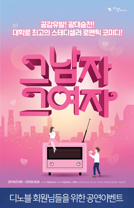 인기 연극 <그남자 그여자>는 설레는 사랑을 시작하는 두 커플의 이야기입니다. 라디오 방송국 PD인 정훈과 정훈의 프로그램에서 DJ를 하고 있는 선애의 사랑 이야기는, 정훈은 선애를 짝사랑하지만 용기가 부족하여 고백하지 못하고 옆에서 바라만 보지만 선애도 사실 정훈을 좋아하고 있는 스토리입니다. 헷갈리는 어른의 연애로 많은 솔로들의 공감을 얻어내는 내용으로 소극적인 그들의 사랑 이야기가 기대를 부릅니다. 또 다른 커플인 정민과 지원은, 대학생 정민은 우연히 버스 정류장에서 같은 대학교에 다니는 지원을 보고 한눈에 반하게 됩니다. 정민은 지원과 함께 버스를 타고 등교하기 위해 다섯 정거장이나 떨어진 버스정류장을 왔다 갔다 하며 지원을 지켜봅니다. 자꾸 눈에 보이는 정민을 지원도 의식하기 시작하며 펼쳐지는 유치한 듯 두근두근한 첫사랑의 향수를 불러일으키는 스토리로 잊고 있던 마음속의 로맨스를 깨워주는 사랑 이야기인 연극 <그남자 그여자>에 디노블 정회원/비회원 2쌍(1인 2매)을 2019년 9월 22일 (일)에 초대합니다.