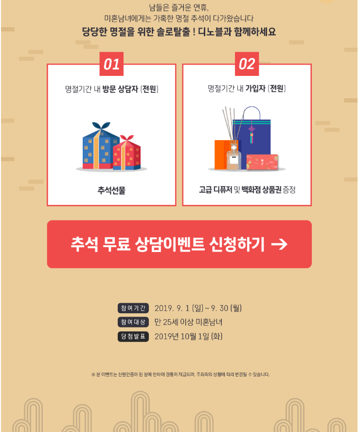 연휴 기간 내 결혼정보회사 디노블을 방문해 상담받는 모든 분들에게 추석선물을 증정하며, 또한 명절 기간 내 가입자 모두에게는 고급 디퓨저 및 가입 등급별 백화점 상품권을 증정합니다! 또한 추석을 맞이하여 참여 기간에 무료 상담 이벤트를 진행하여 솔로탈출을 원하는 미혼남녀를 위해 결혼 전문가들의 상담을 받을 수 있는 이벤트는 2019.09.01 (일) ~ 2019.09.30(월)까지 진행하니 외로운 가을에서 탈출하고 싶은 분들의 많은 참여 바랍니다!