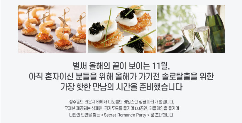 벌써 올해의 끝이 보이는 11월, 아직 혼자이신 분들을 위해 성수동의 라운지 바에서 열리는 비밀스러운 싱글파티! 무제한 제공되는 샴페인과 핑거푸드를 즐기며 DJ의 공연, 다양한 커플 게임을 즐기며 나만의 인연을 찾는 로맨틱한 만남의 기회인 <Secret Romance PARTY> !