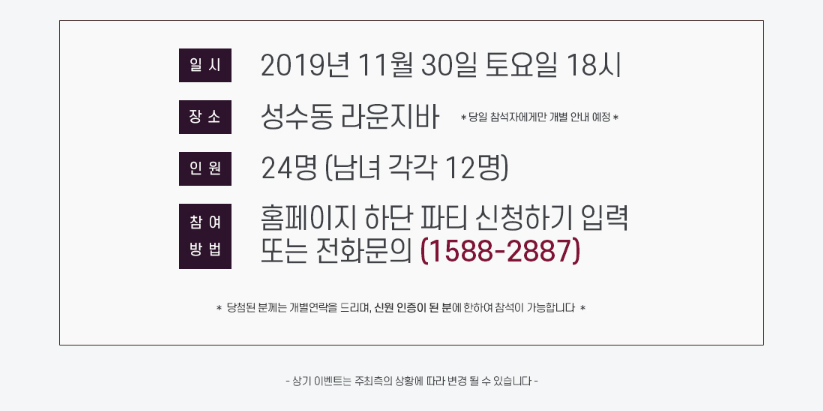 디노블만의 특별한 <Secret Romance PARTY>는 2019년 11월 30일 (토) 18시, 성수동 라운지바에서 열리며 미혼남녀 24명을 초대해 열립니다. 참석을 원하는 솔로분들이라면 디노블의 홈페이지 하단의 파티 신청하기 및 대표번호로 문의하시면 됩니다!