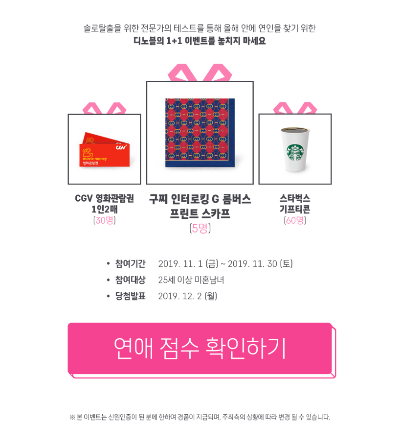 솔로탈출을 위한 결혼 전문가 테스트인 '연애 점수 확인하기'를 통해 올해 안에 운명을 찾기 위한 솔로들을 위한 디노블의 <1+1> 이벤트! 25세 미혼남녀라면 누구나 간단한 결혼 테스트를 통해 참여가 가능하며 추첨을 통해 구찌 스카프, CGV 영화 예매권, 스타벅스 기프티콘을 드립니다!