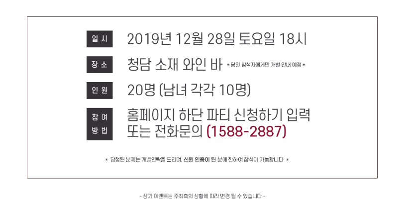 올해는 꼭 솔로탈출에 성공하겠다고 결심했지만 무심하게도 다시 찾아온 솔로의 연말, 그 외로움을 위로하기 위해 2020년에는 좋은 인연과 함께 시작하고 싶은 분들을 위해 청담에 위치한 와인 바에서 라이브 음악과 함께 하는 설레는 만남의 기회인 <Adios 2019> 미팅파티!