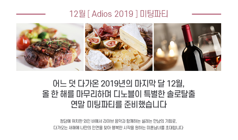 매달 색다른 컨셉으로 진행되는 직장인 소개팅 전문 디노블의 솔로탈출 미팅파티! 이번 달에는 2019년을 떠나보내며 마지막 12월의 만남의 기회를 제공하는 <Adios 2019>를 준비했습니다.