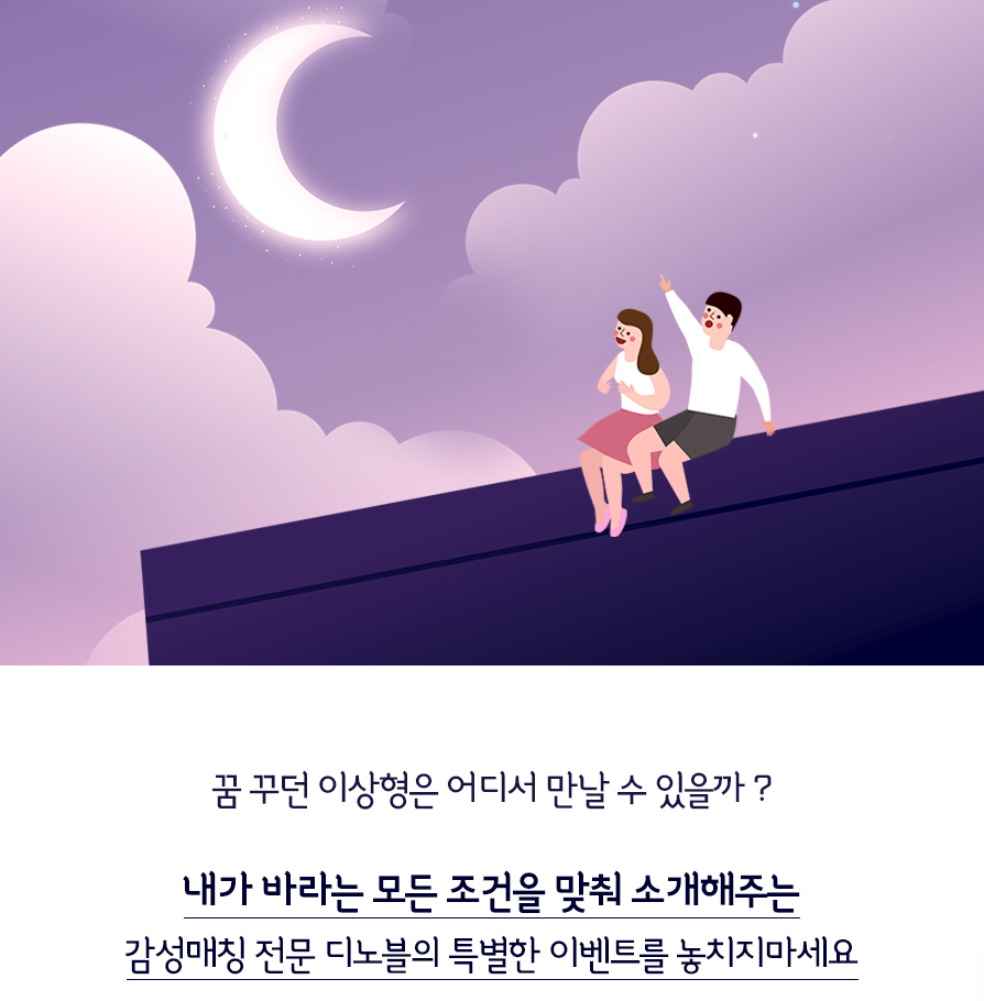 매달 색다른 컨셉으로 다양한 이벤트를 진행 중인 솔로탈출 전문 디노블이 준비한 8월 이벤트는 <디노블아, 솔로탈출을 부탁해>로 나에게 꼭 맞는 이상형을 찾아주는 디노블의 특별한 감성매칭을 체험해 볼 수 있는 무료 맞선의 기회를 제공해드립니다.