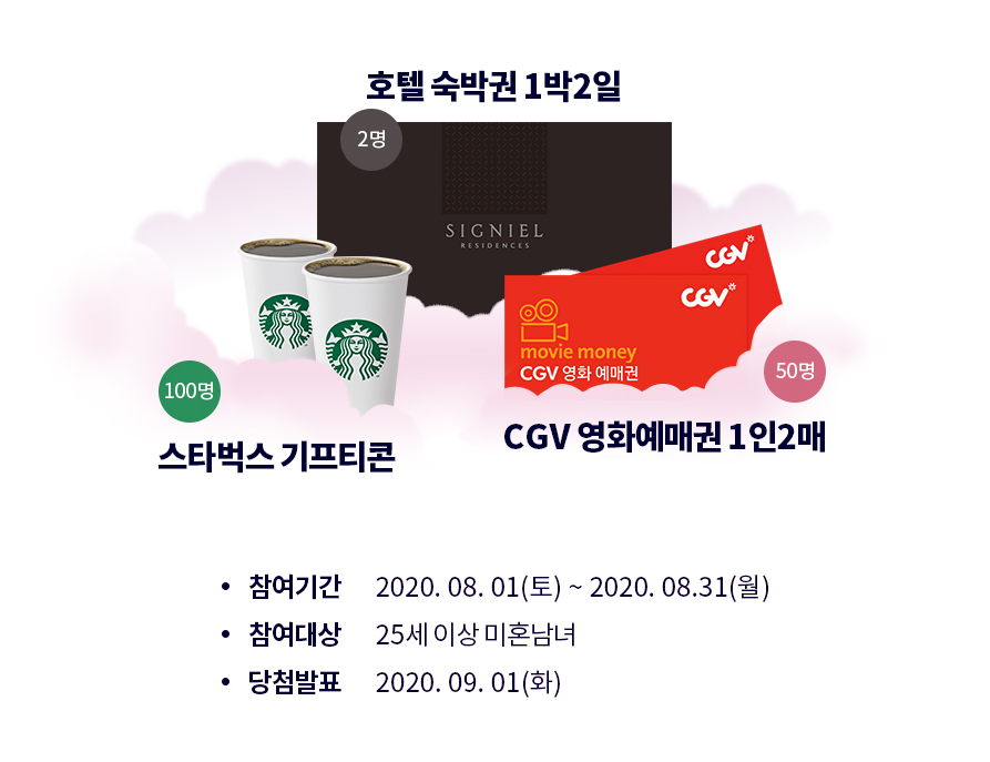 참여 기간은 2020.08.01 (토) ~ 2020.08.31 (월)까지이며, 당첨 발표는 2020.09.01 (화)에 개별 연락드릴 예정입니다. 8월에는 꼭 좋은 인연을 만나 새로운 사랑을 시작하고 싶은 대한민국의 25세 이상 미혼남녀 분들이라면, 이번 기회를 놓치지 마세요!