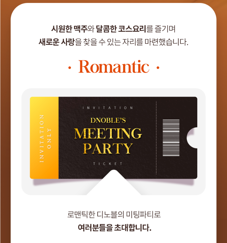 금요일 저녁, 퇴근 후 간단한 맥주와 함께 새로운 사랑을 찾을 수 있는 디노블의 9월 직장인 미팅파티는 격식 있는 만남이 부담스러운 분들에게 더없이 좋은 만남의 기회입니다.