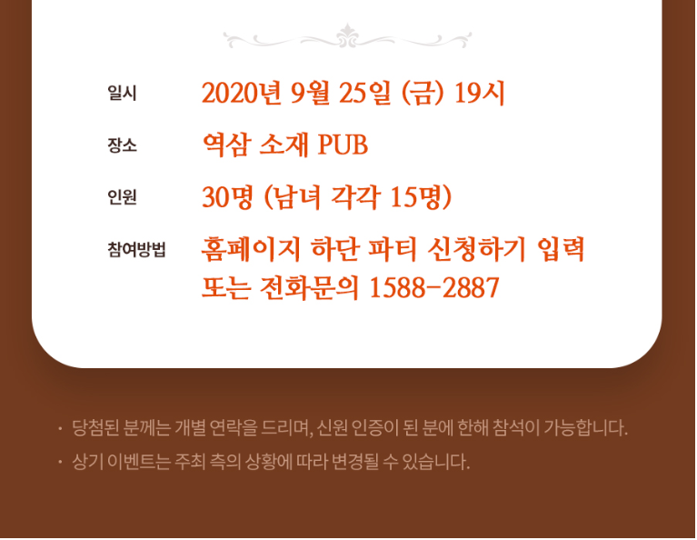 파티에 참여하고 싶은 분들은 결혼정보회사 디노블의 홈페이지 하단 파티 신청하기 입력 또는 대표번호로 문의하시면 됩니다.