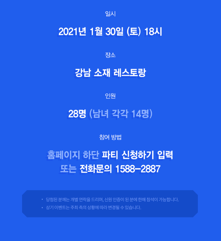 <Happy New Love> 미팅파티는 2021년 1월 30일 (토) 18시에 열리며, 남녀 14쌍을 초대할 예정입니다. 파티는 선착순으로 마감되기 때문에 관심 있는 싱글분들의 빠른 신청 바랍니다!