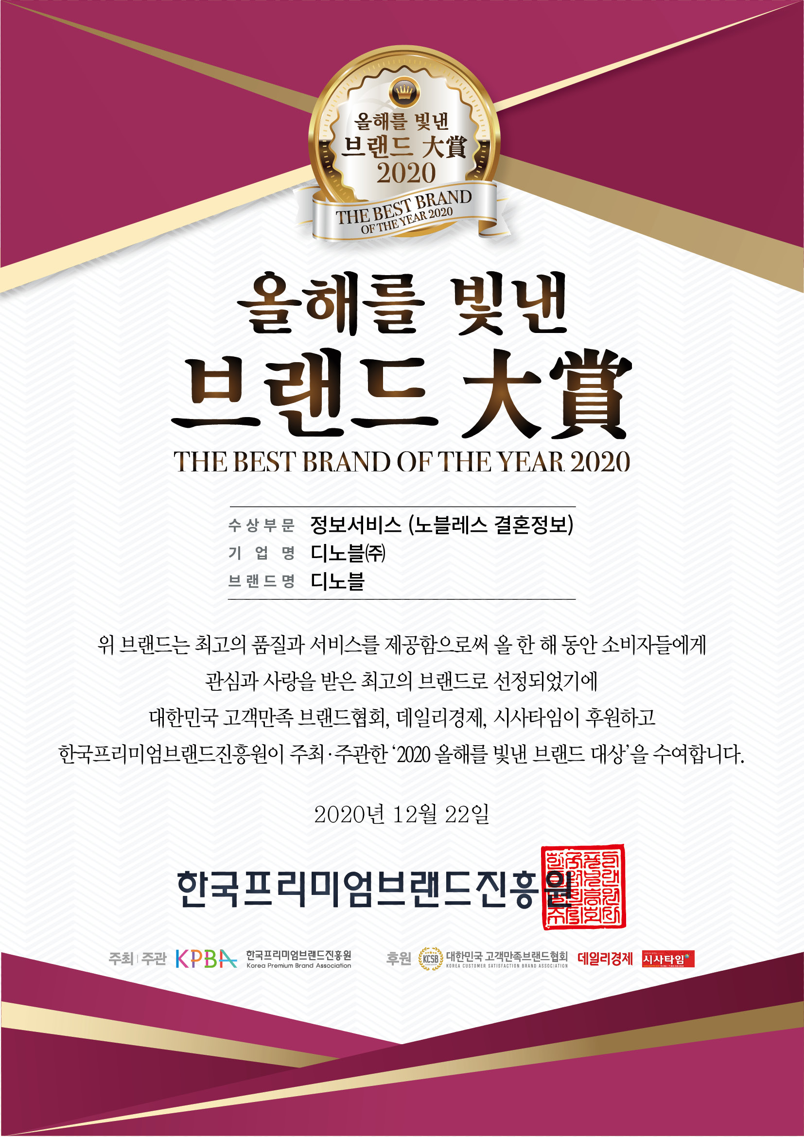 2020 올해를 빛낸 브랜드 대상은 올 한 해를 함께한 브랜드를 총 결산하여 각 사업분야에서 소비자의 사랑을 받은 주인공을 선정하는 어워드로 결혼정보업체 디노블이 수상하는 영광을 안았습니다.