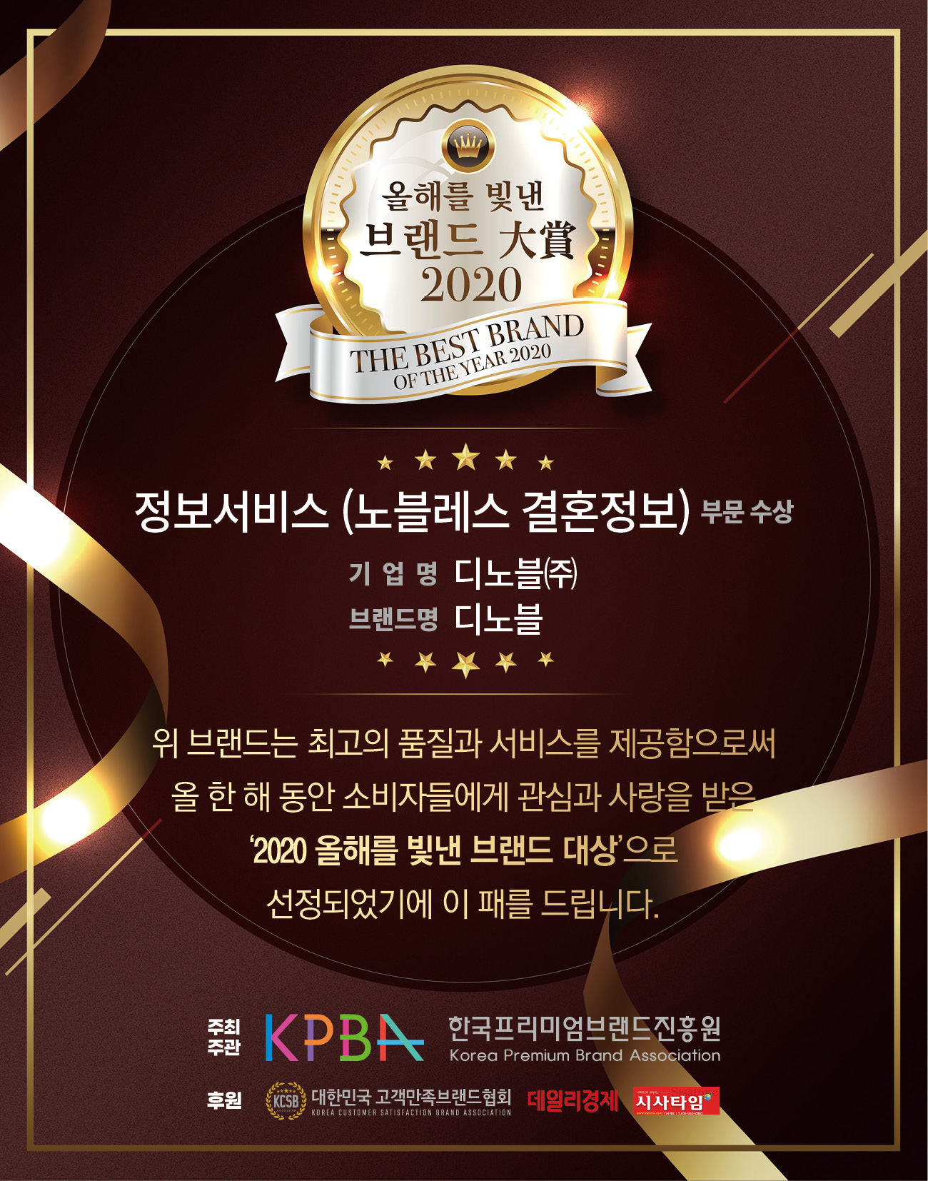 안녕하세요. 결혼정보회사 디노블 강남 라이프입니다. 디노블이 지난 12월 22일 대한민국 고객만족 브랜드 협회, 데일리경제, 시사타임이 후원하고 한국프리미엄브랜드진흥원이 주최, 주관하는 '2020 올해를 빛낸 브랜드 대상'에서 정보 서비스(노블레스 결혼정보) 부문을 수상하였습니다!