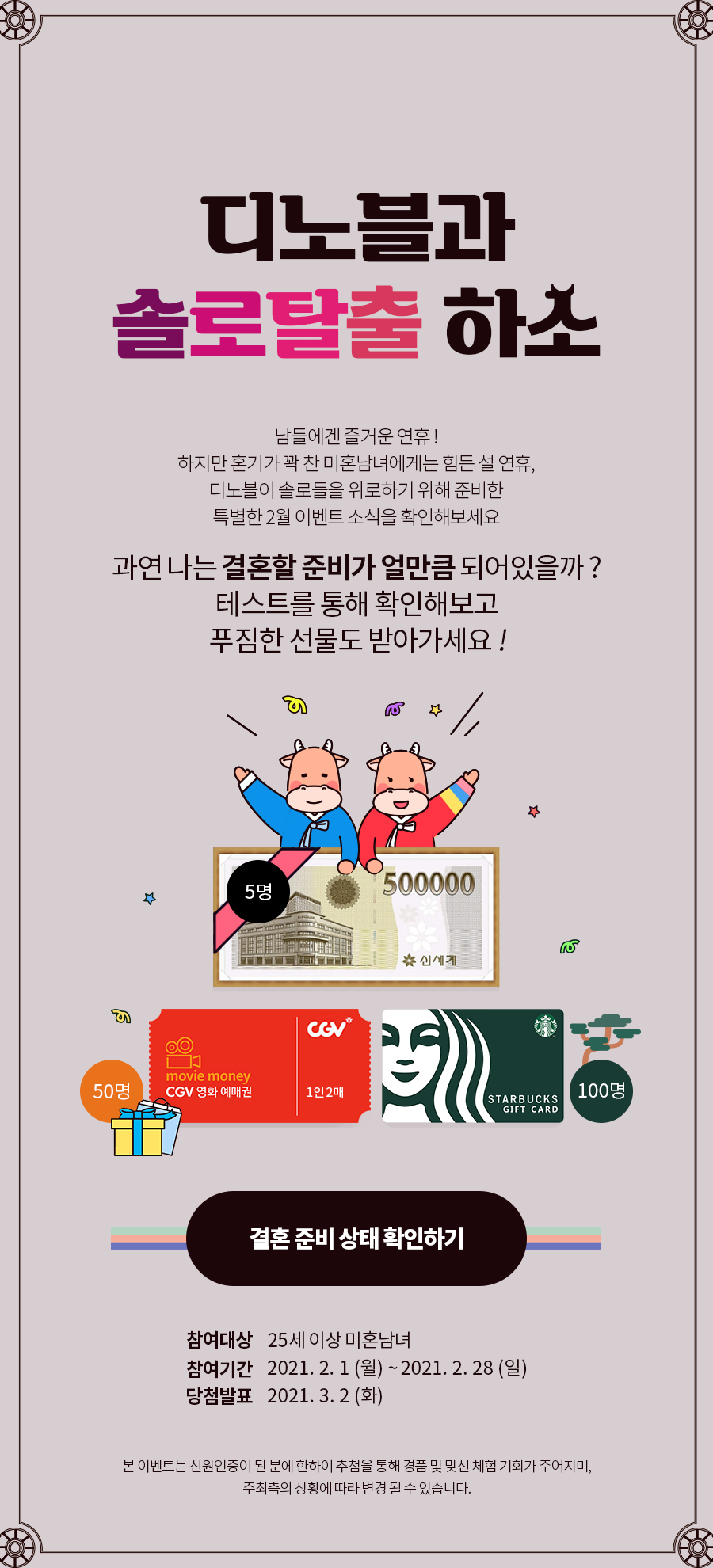 참여 대상은 25세 이상의 대한민국 미혼남녀라면 누구든지 참여 가능하며 참여 기간은 2021.02.01 (월) ~ 2021.02.38 (일)까지입니다. 당첨 발표는 2021년 3월 2일 개별 연락드릴 예정입니다. (단, 이벤트 대상이 아닐 경우 참여가 제한될 수 있습니다.)