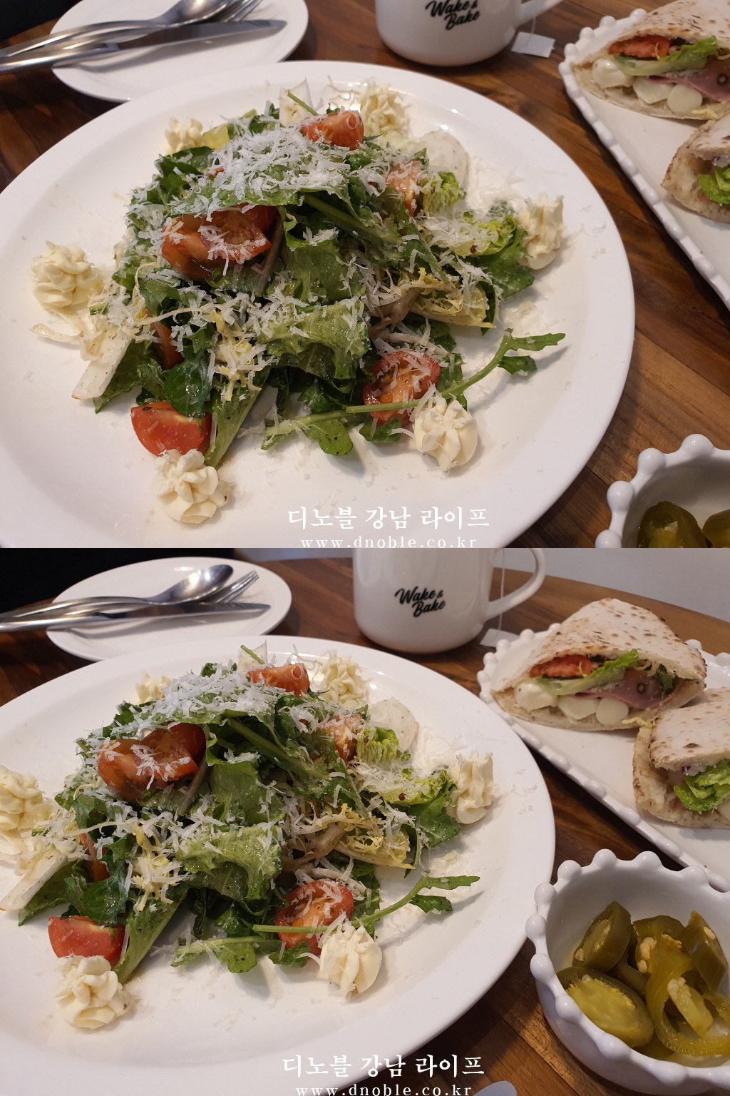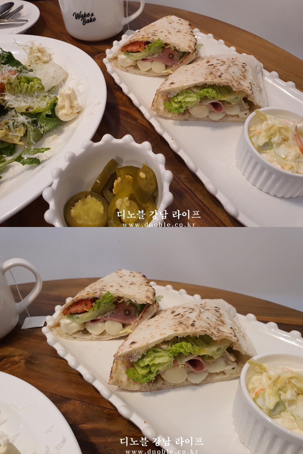 웨이크 앤 베이크의 시그니처 메뉴인 샌드위치로 콘 수프 느낌이 나는 소스에 치커리, 토마토, 적양파, 피스타치오, 트러플 리코타 치즈가 같이 씹혀 아삭한 식감을 느낄 수 있습니다.