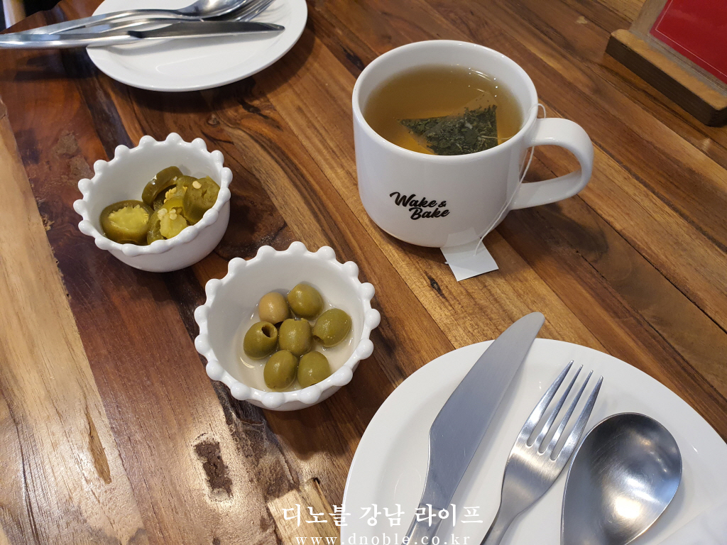 매콤한 맛으로 입맛을 사로잡는 할라피뇨 피클과 더불어 올리브를 함께 곁들여 먹을 수 있고 소화를 도와주는 페퍼민트 티와 같이 카페인을 선호하지 않는 분들에게는 따뜻한 티 종류를 추천드립니다.