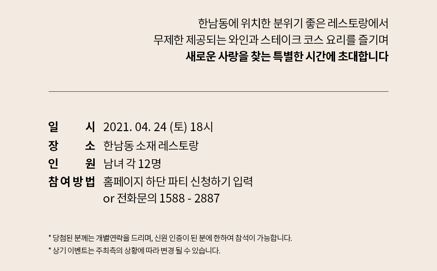 <A Beautiful Spring Day> 미팅파티는 2021년 4월 24일 (토) 18시, 한남동에 위치한 분위기 좋은 레스토랑에 남녀 각 12명씩 초대될 예정이며 신원인증이 된 분들에 한하여 참석이 가능하기에 다른 걱정 없이 만남에만 집중할 수 있습니다.