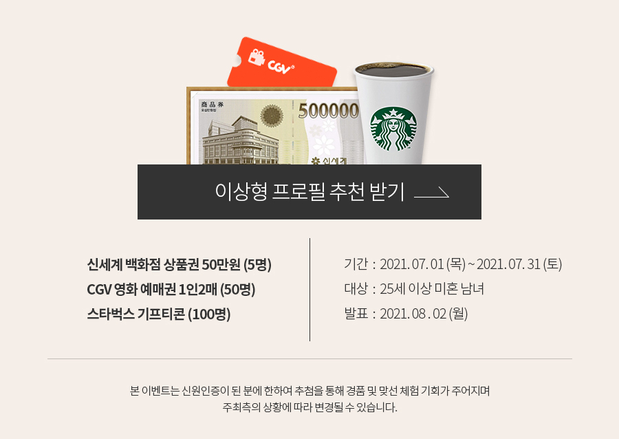 이상형 추천 받기 테스트를 신청해 주신 분들 중 추첨을 통해 신세계 백화점 상품권 50만 원 (5명), CGV 영화 예매권 (1인 2매), 스티벅스 기프트콘을 증정해드리며 참여 기간은 7월 1일 (목) ~ 7월 31일 (토)까지입니다. 이번 기회로 디노블 결혼정보회사에서 이상형 프로필도 추천 받고 푸짐한 선물도 놓치지 마세요!