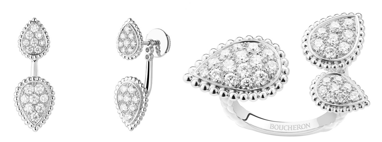 또한 그녀가 착용하고 나왔던 부쉐론 주얼리 중 스터드 이어링은 화이트 골드 소재에 다이아몬드가 파베 세팅되어, 개별 착용이 가능한 섬세하면서도 실용성이 돋보이며 세 개의 꽃 모티브로 선보이는 반지는 브랜드의 이미지에 걸맞게 우아하고 다양하게 연출이 가능합니다.