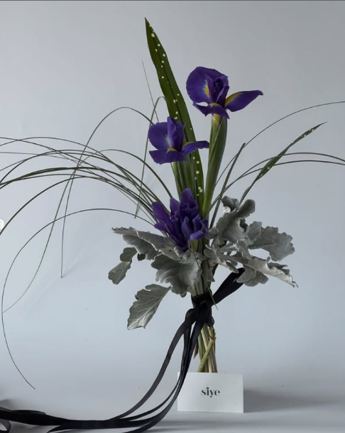 깊고 풍부한 퍼플 아이리스를 중심으로, 부드러운 그린 잎과 은은한 실버 빛 잎들이 조화를 이루고 있어요.
