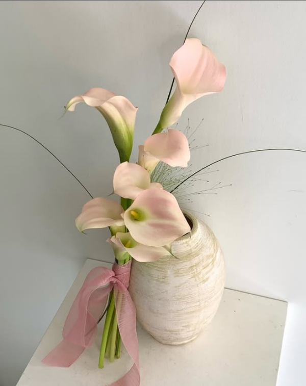 부드러운 핑크색 칼라 릴리를 중심으로 사랑스럽고 로맨틱한 분위기를 자아내요.