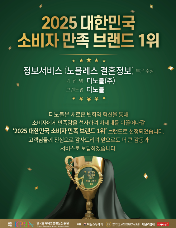 디노블, ‘2025 대한민국 소비자 만족 브랜드 대상’ 프리미엄 결혼정보 서비스 부문 1위 수상!