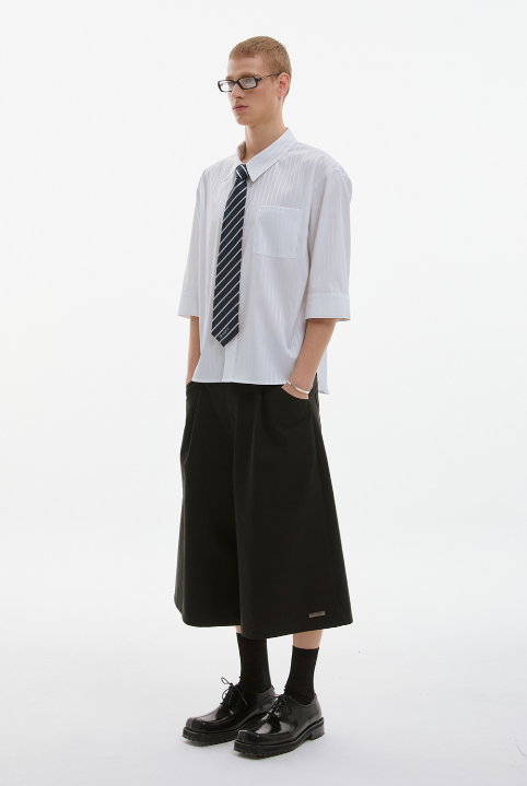 헤링본 오버핏 롤업 하프 셔츠_블랙 50,000원
