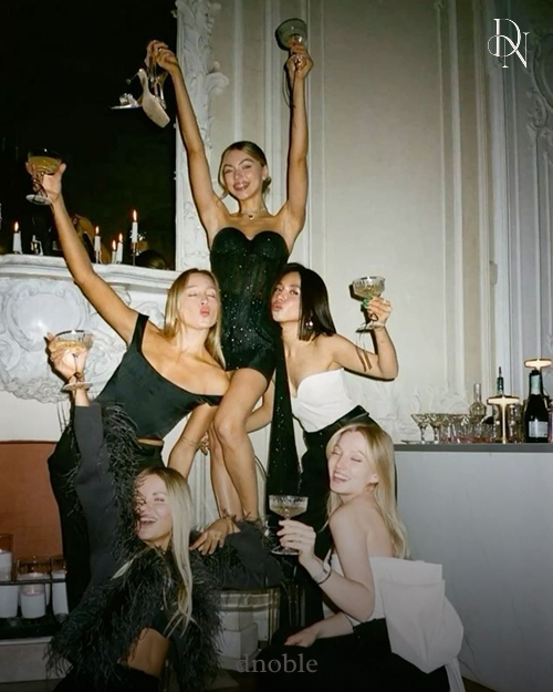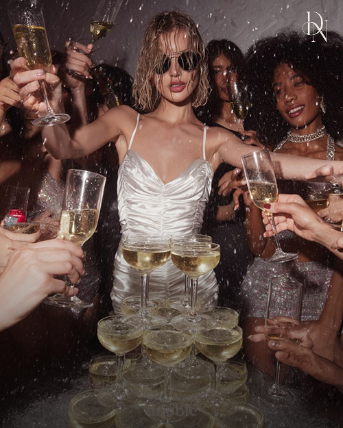블랙 드레스로 시크함과 화려함 강조! 샴페인 잔을 높이 들고