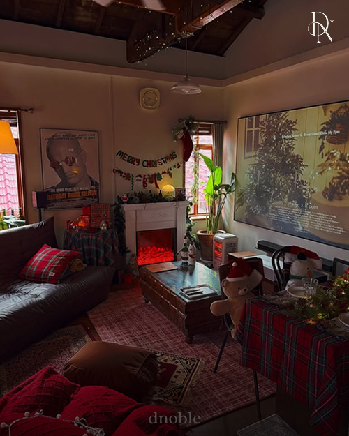 붉은 체크 패턴과 벽난로, 대형 스크린까지 그야말로 크리스마스 감성이 꽉 찬 공간.