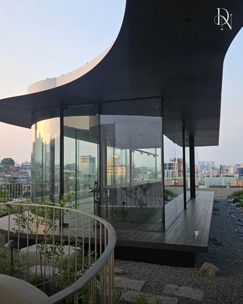 유리와 곡선 건축이 만들어낸 모던한 실루엣.
