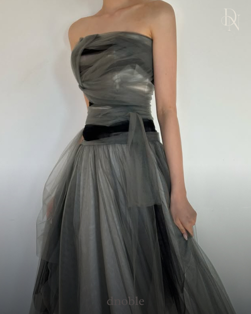 어깨의 리본 끈 디테일과 풍성하게 퍼지는 블랙 튤 스커트가