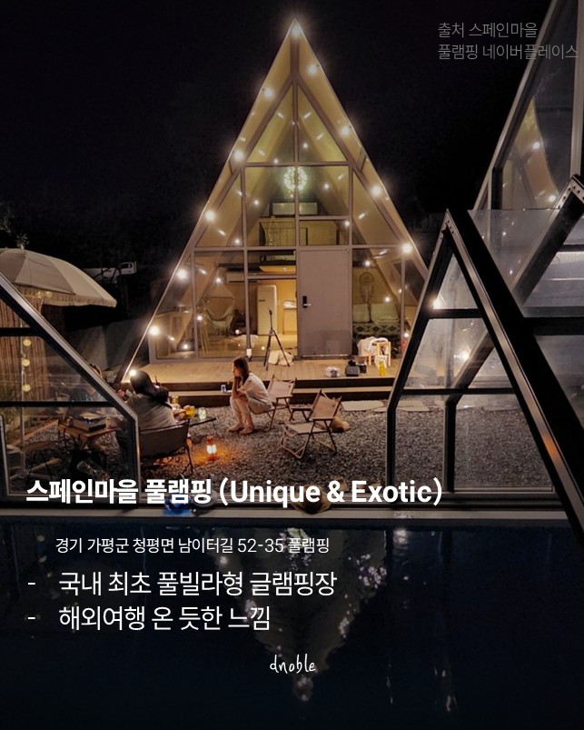 국내 최초 풀빌라형 글램핑장으로, 이름처럼 스페인 휴양지에 온 듯한 이국적인 풍경을 자랑합니다.
