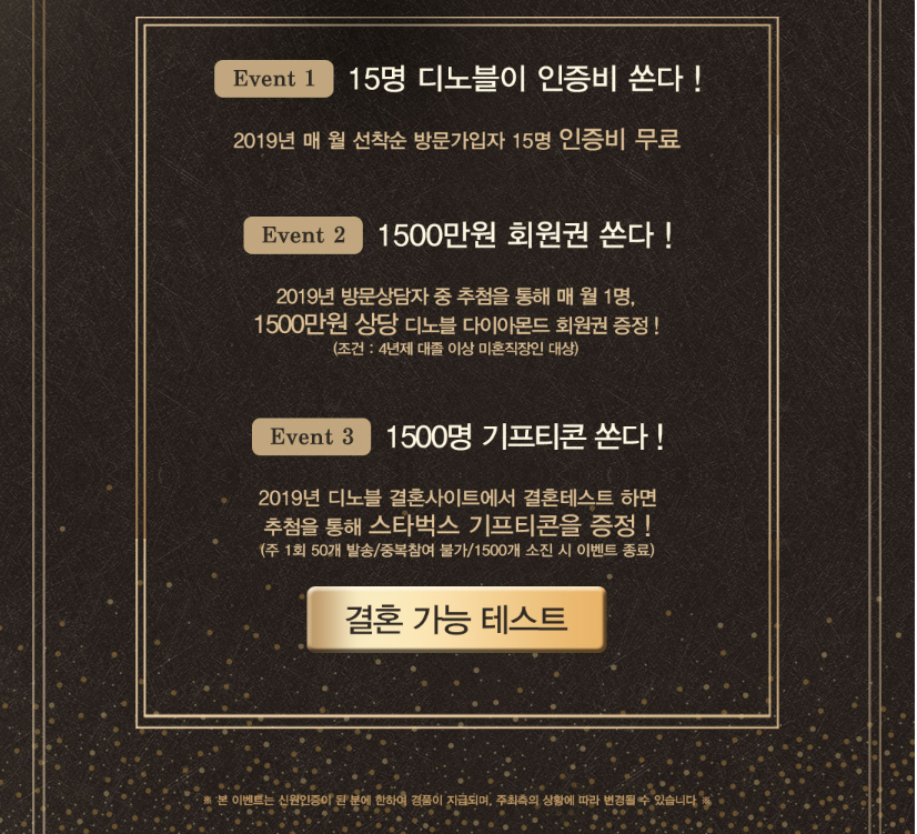 결혼정보회사 디노블의 창립 15주년의 첫 번째 이벤트는 2019년 매월 선착순 방문 가입자 15명이게 인증비를 무료로 제공합니다. 두 번째는 2019년 방문상담자 중 추첨을 통해 매월 1명에게 1500만 원 상당의 디노블 다이아몬드 회원권을 증정합니다. 세 번째 이벤트는 2019년 디노블 결혼사이트에서 결혼 테스트를 하면 추첨을 통해 스타벅스 기프티콘을 드립니다!