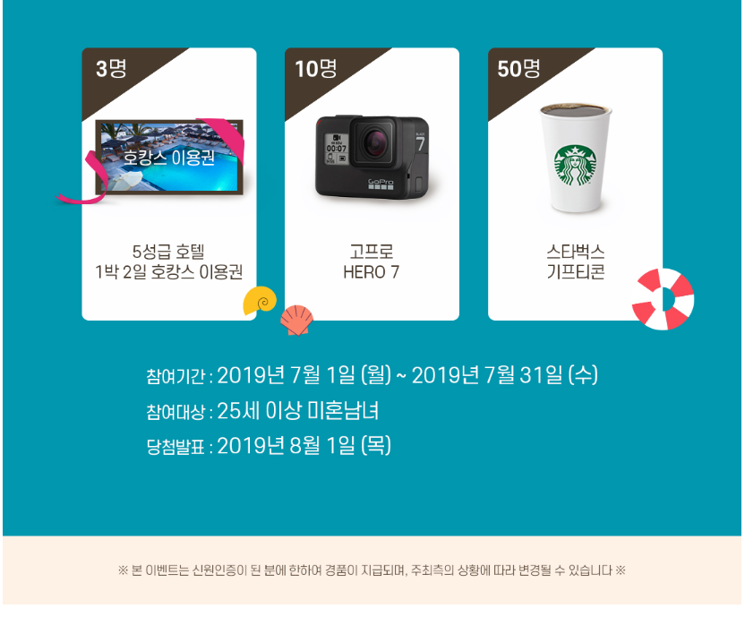 서울 소재 5성급 호텔 1박 2일 호캉스 이용권, 낭만적인 여름휴가의 소중한 추억을 담아줄 고프로 HERO7, 스타벅스 기프티콘을 직장인 소개팅 전문 디노블의 연애 진단 테스트를 진행하신 분들 중 추첨을 통해 증정합니다. 참여 기간은 2019년 7월 1일 (월) ~ 2019년 7월 31일 (수)까지이며 25세 이상의 미혼남녀라면 누구든지 참여 가능합니다! 당첨자는 2019년 8월 1일 (목) 개별 연락드립니다!