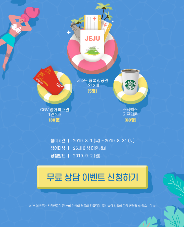그 이외에도 신청자들 중 추첨을 통해 제주도 왕복 항공권 (1인 2매), CGV 영화권, 스타벅스 기프티콘을 증정할 예정입니다! 참여 기간은 2019년 8월 1일 (목) ~ 2019년 8월 31일 (토)까지 진행되며 당첨자는 2019년 9월 2일 (월) 개별 연락드릴 예정입니다.