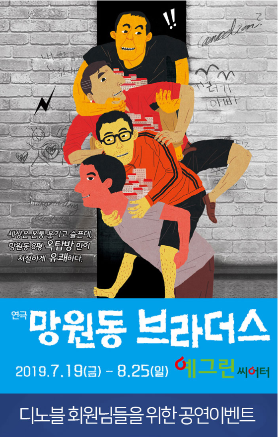 솔로탈출 전문 디노블이 정/준회원 분들을 위한 8월의 초대 공연 이벤트를 준비했습니다. 이번 달 소개해드릴 연극인 '망원동 브라더스'는 제9회 세계문학상 우수상을 수상한 김호연의 장편소설을 연극화한 작품으로 코딱지만 한 망원동 옥탑방에서 기묘한 동거를 시작한 지질한 네 남자의 웃픈 이야기를 담고 있습니다. 20대 만년 고시생, 30대 백수, 40대 기러기 아빠, 50대 황혼이혼남까지 세대별 문제가 있는 남성들이 모여 옥탑방에서 펼쳐지는 고군분투 재기 프로젝트로 서로를 위로하고 아껴주는 가슴 따뜻한 이야기입니다.