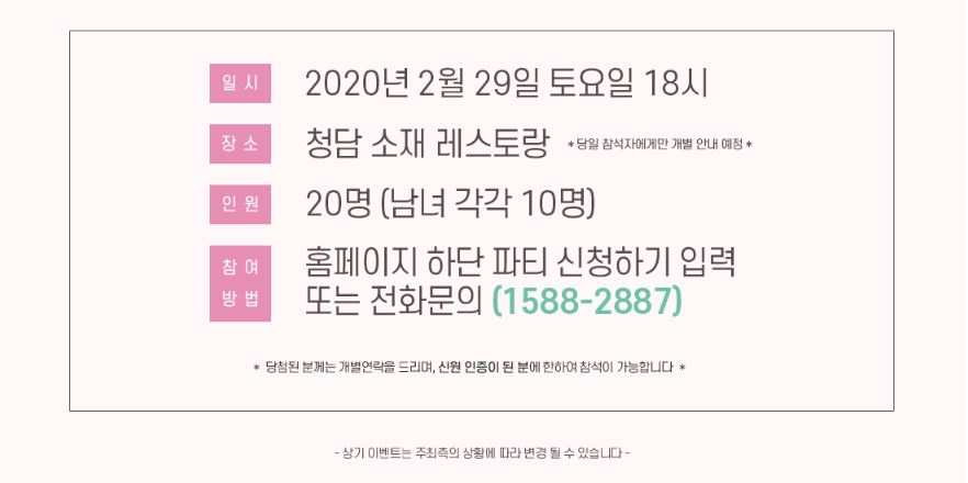 오는 2월 29일 토요일, 18시 청담 소재 레스토랑에서 진행될 예정이며, 달콤한 사랑을 시작하고 싶은 미혼남녀분들을 초대합니다! 관심 있는 분들의 많은 신청 기다리겠습니다.