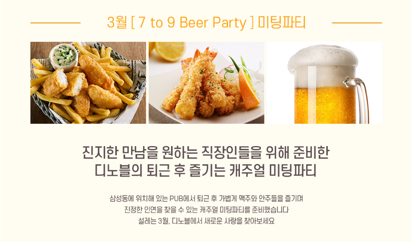 30대 직장인 소개팅 디노블의 3월 미팅파티는 <7 to 9 Beer Party>로 퇴근 후 즐기는 캐주얼한 만남을 컨셉으로 진행될 예정입니다.
